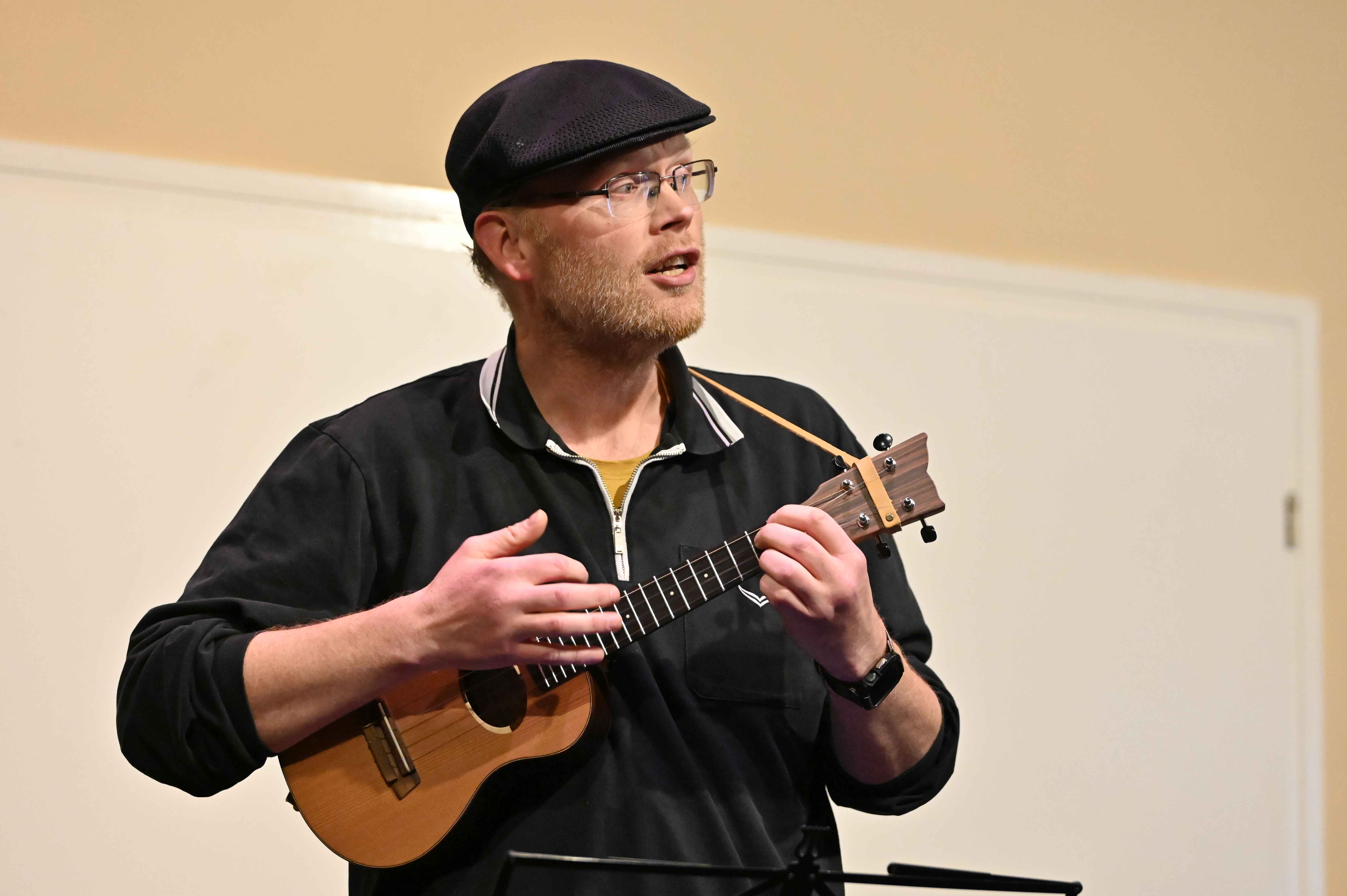 This wasn't Helge Kirscht's first appearance at the Folk Club, but who remembers his performance in November 2015 without looking it up? Helge's specialty is funny or thoughtful songs in German, sometimes with a "stolen" melody. The song "Smile" has an English title and an English chorus ("Why don't you like my smile?"), but the lyrics themselves are an uplifting German tune. Everything goes wrong, but the hero doesn't lose his cool. We like to remember songs with a similar theme: Jürgen von der Lippe once sang "Guten Morgen, liebe Sorgen" or Bobby McFerrin "Don't Worry, Be Happy" - very uplifting! To the tune of Phil Collins' "Another Day In Paradise", Helge wrote the song "Frankfurt West" about the dreary working day in Frankfurt. But it could also be somewhere else. Bill Ramsey's funny song "Ohne Krimi geht die Mimi nie ins Bett" from 1962 brought back memories of our childhood. This was Helge's contribution to the evening's theme, as Bill Ramsey's trademark was his pronounced American accent, which he probably cultivated - delicious.
